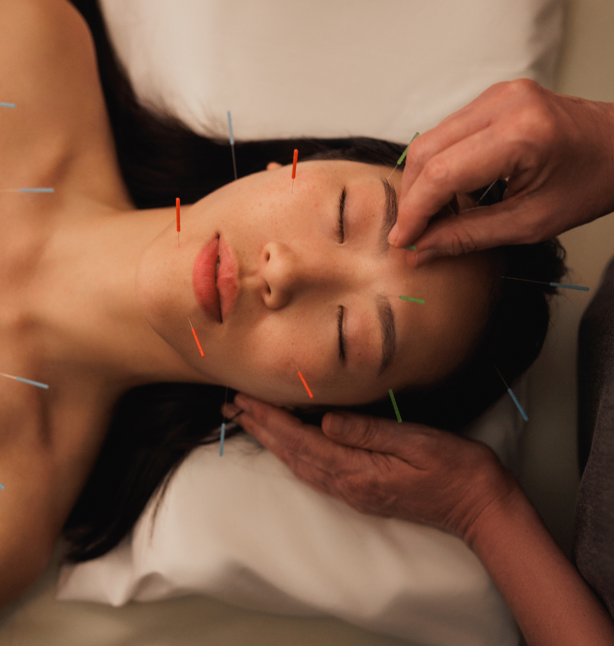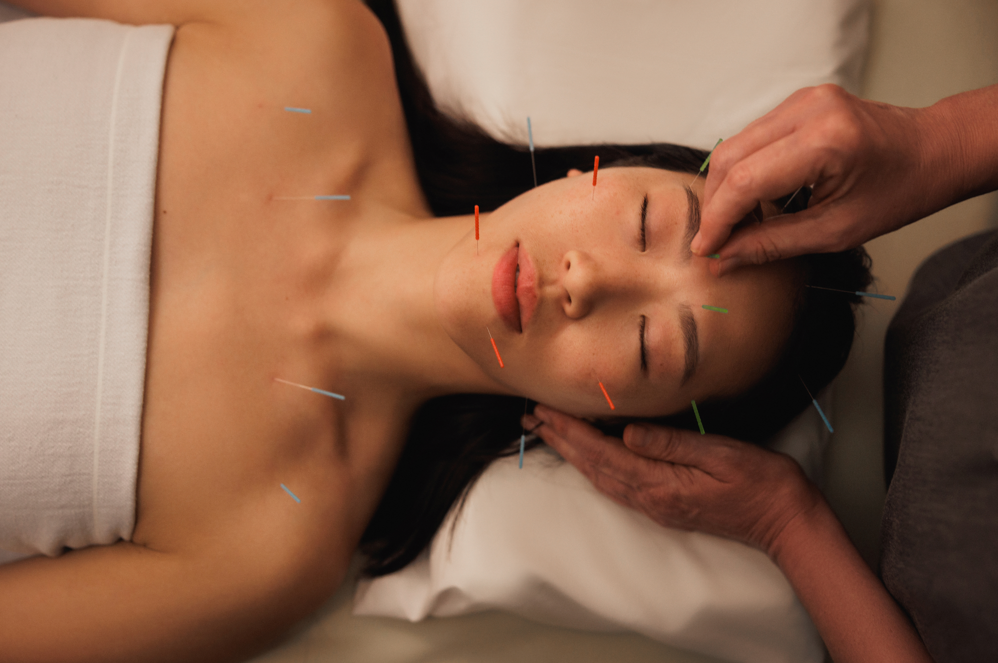 Not at all like you might imagine! The needles we use are hair-thin and most people feel little more than a light tap. In fact, most clients find facial acupuncture deeply relaxing and leave feeling like they’ve caught up on sleep.